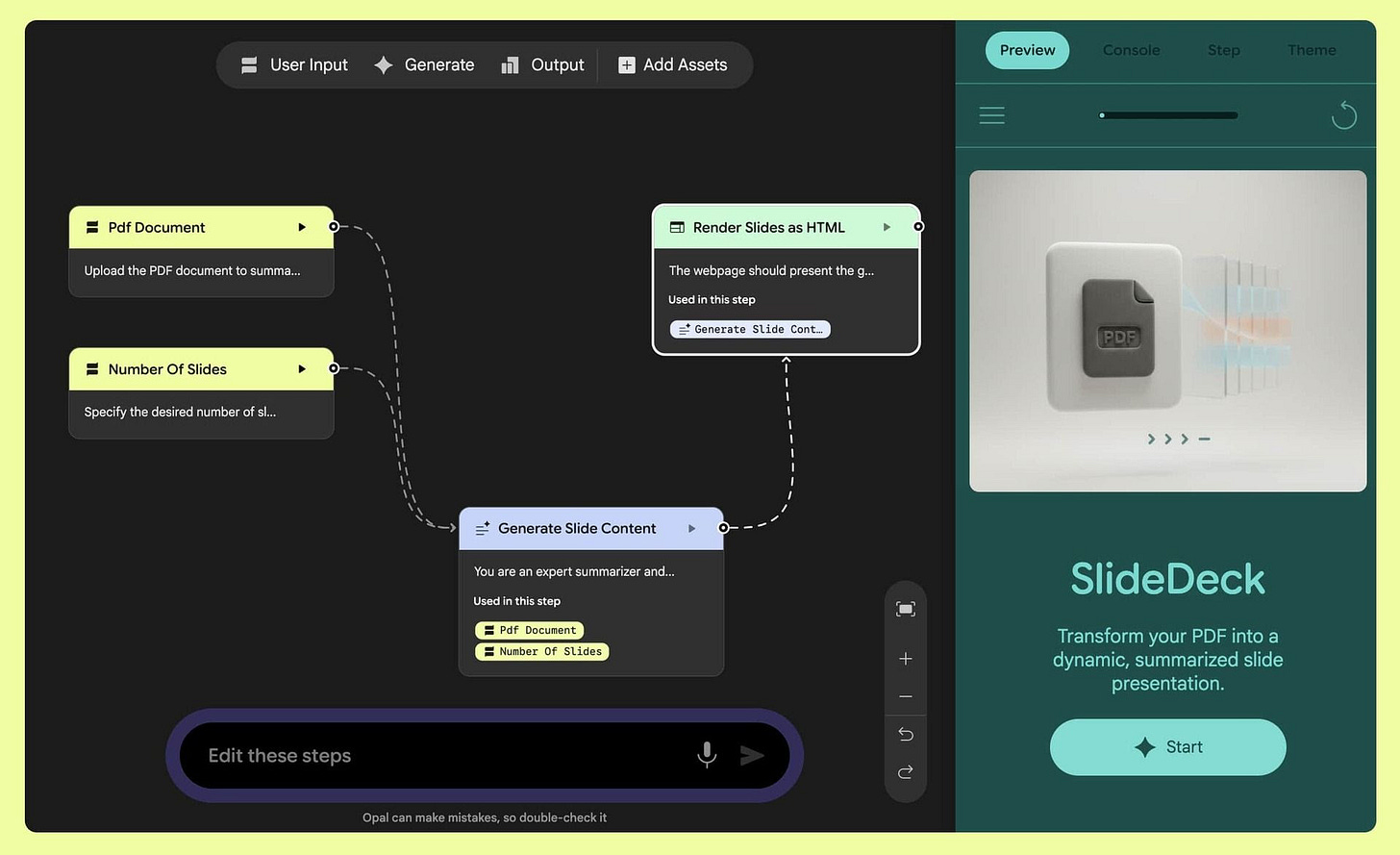 "Diseñá una app donde el usuario pueda cargar un dataset de comportamiento de clientes y ver patrones de compra segmentados por región, usando gráficos claros"Opal va a generar el flow de la app en segundos, donde vas a poder editar/agregar/eliminar cualquier paso